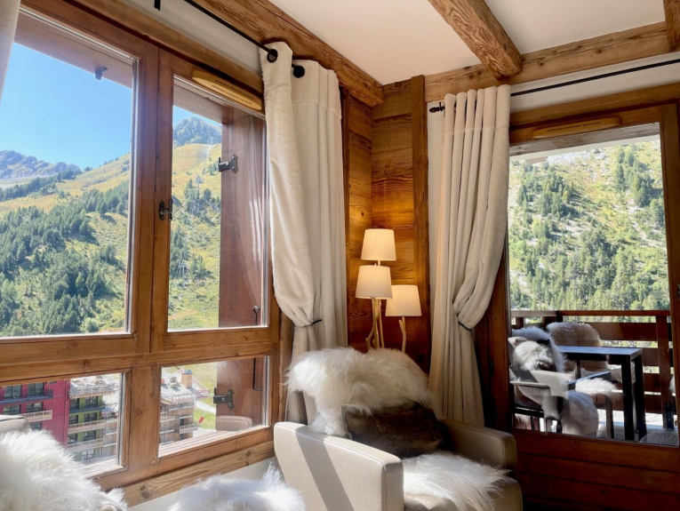 Il soggiorno si apre su un balcone con vista panoramica sulle montagne e sulle piste da sci.