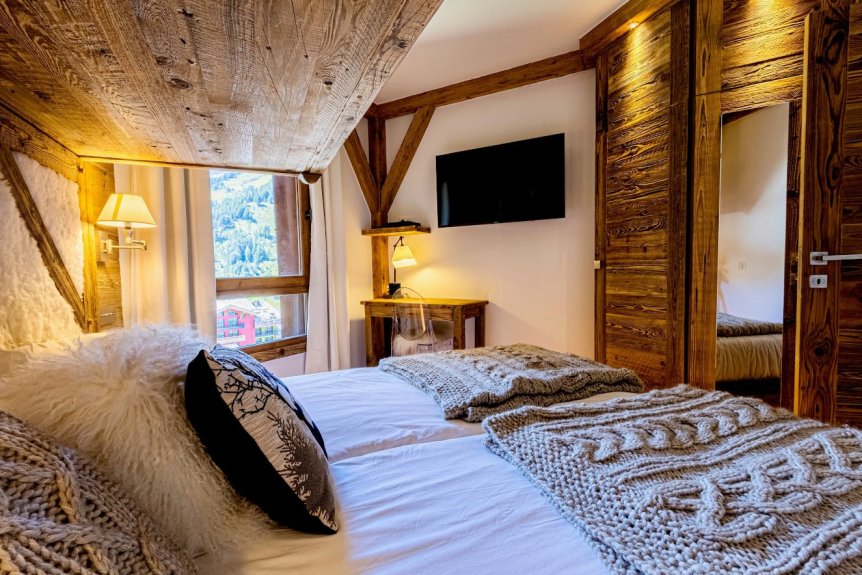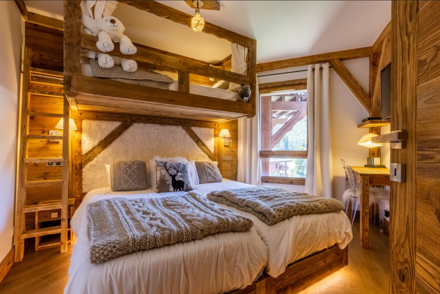 La camera da letto familiare è dotata di 2 letti da 90 x 200 che possono essere trasformati in un letto king size su richiesta, un letto sospeso a spirito di montagna da 80 x 190, una scrivania, una grande TV a schermo piatto e un lettore DVD.