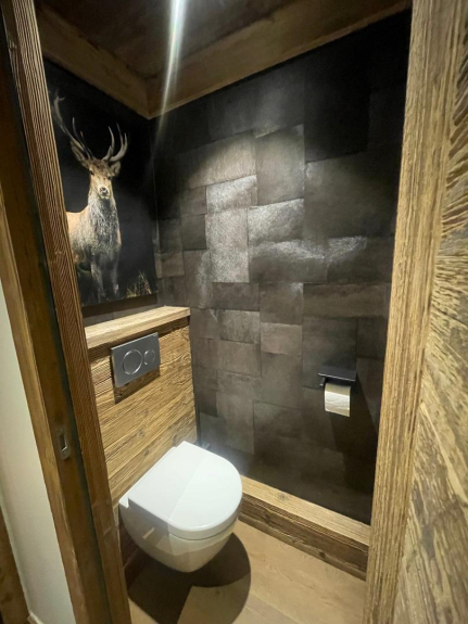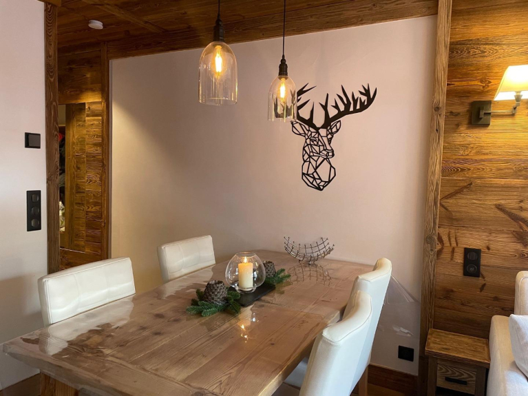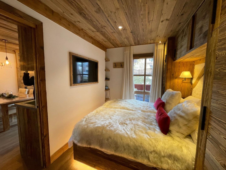 Questo magnifico appartamento, completamente ristrutturato per 2-4 persone in un prestigioso stile chalet, ski-in/ski-out, situato nella residenza 5* Le Hameau du Glacier, offre servizi rari e unici nel villaggio.