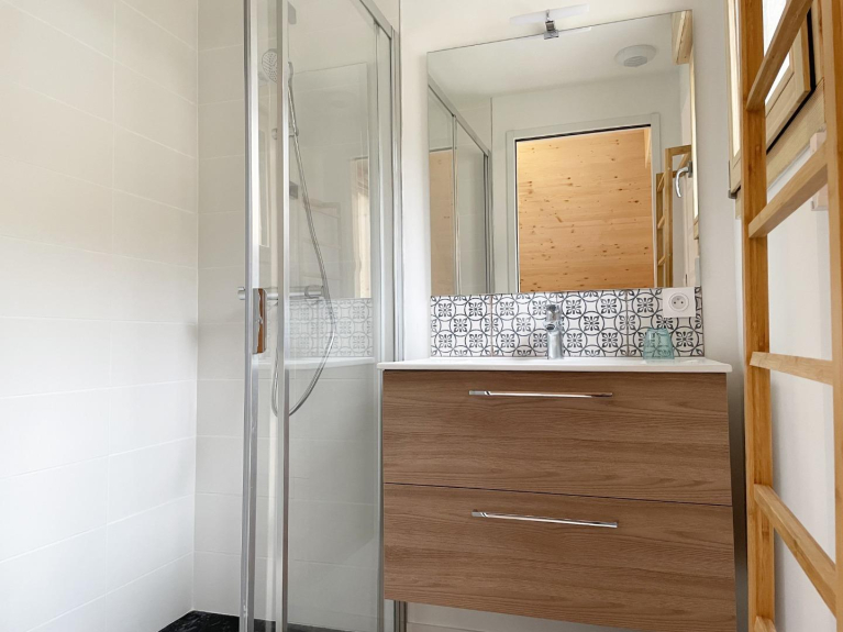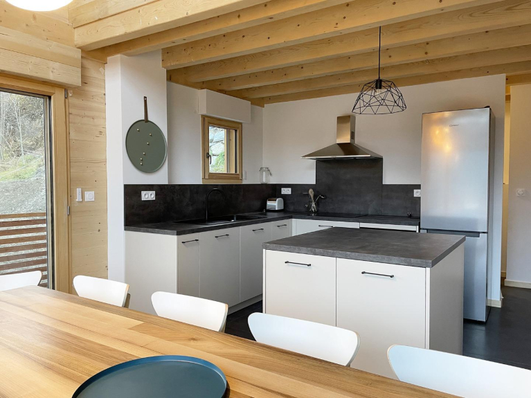 - Al primo piano, un open space inondato di luce con un soggiorno dotato di un divano ad angolo, poltrone e un angolo TV, un grande tavolo in legno e una cucina completamente attrezzata con un'isola centrale per condividere la preparazione dei pasti, e un ripostiglio per riporre la spesa. La zona pranzo si apre su una grande terrazza panoramica attrezzata con mobili da giardino e un barbecue. Troverete anche su questo piano: una toilette separata, una camera da letto con un letto estraibile (2 letti singoli o 1 letto matrimoniale 160x200). Un bagno e un calcio balilla completano il layout di questo piano.