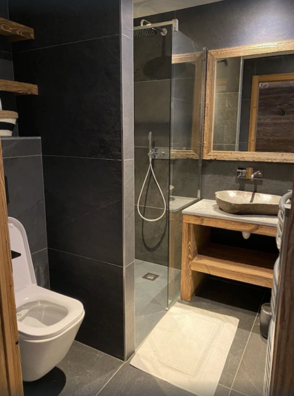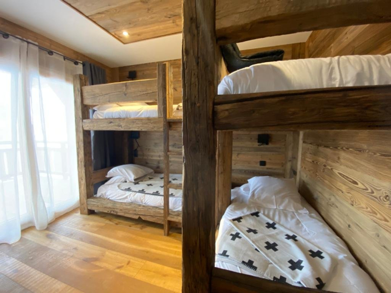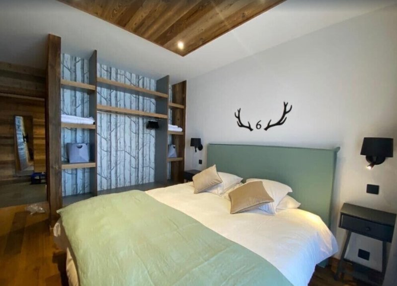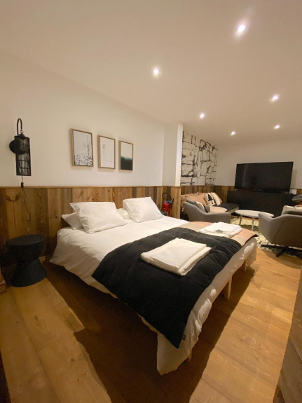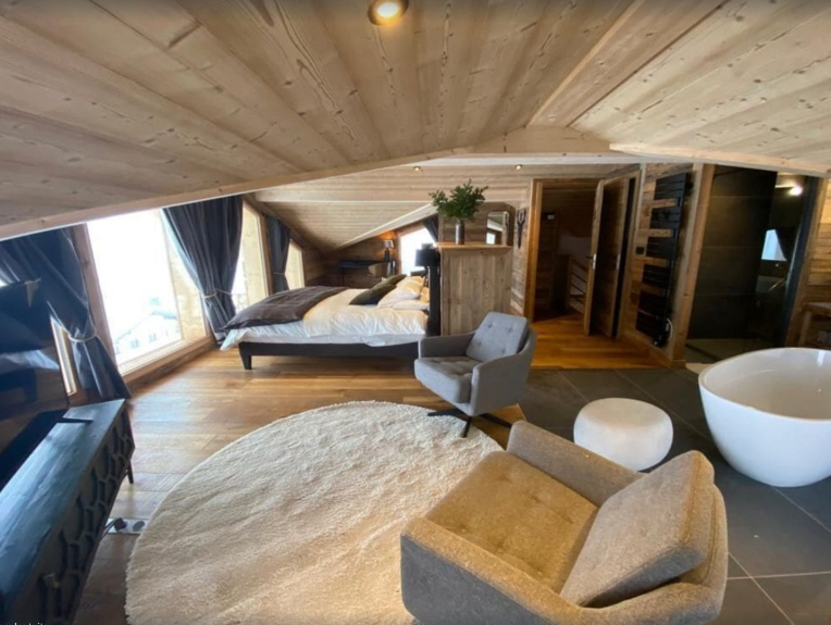 - 1 suite composta da un letto 180x200 sotto il tetto con un divano letto che può ospitare 2 letti supplementari e una zona scrivania e un bagno e doccia con vista sulle piste.