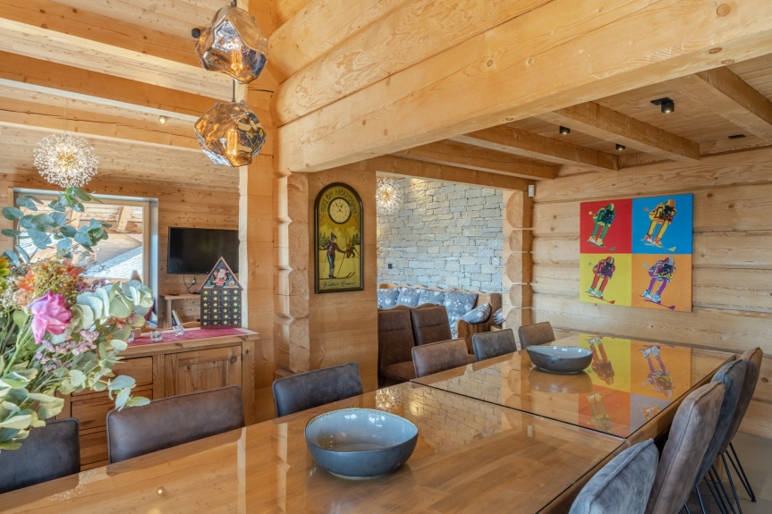 Si compone di un soggiorno con cucina completamente attrezzata (forno, piano cottura, frigorifero, lavastoviglie, microonde, tostapane, macchina per il caffè, bollitore elettrico, cantina per i vini e macchina per la raclette) aperta sulla sala da pranzo, 6 camere doppie (di cui una da 4 posti letto), ognuna con il proprio bagno con doccia (doccia, lavabo e WC).