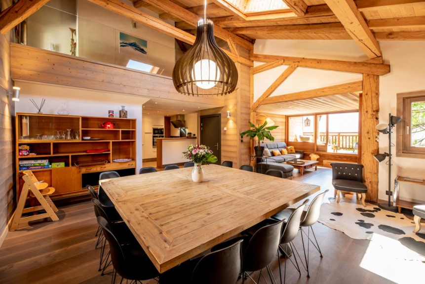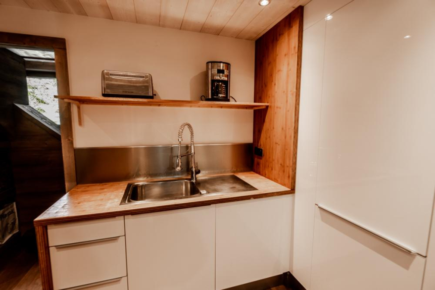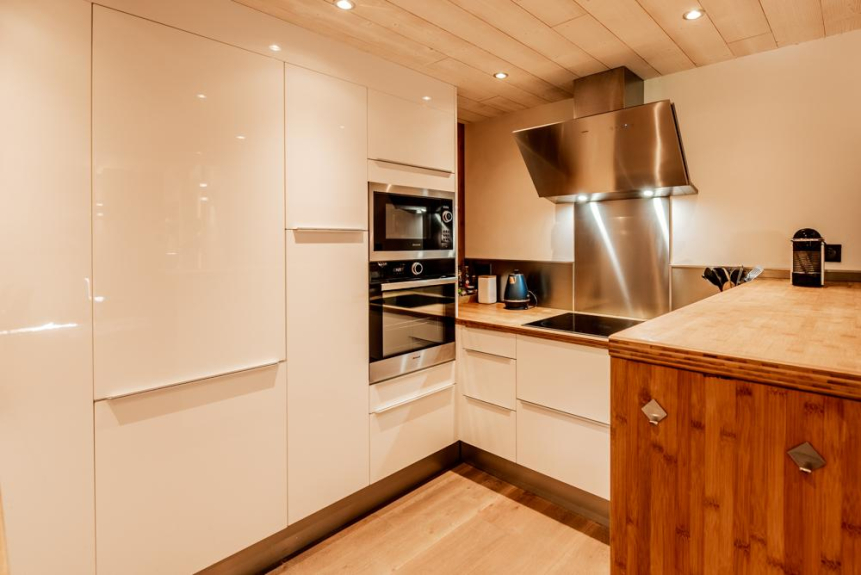 - una cucina a vista completamente attrezzata (frigorifero, congelatore, forno, microonde, tostapane, fornello a induzione, lavastoviglie, macchina per il caffè Nespresso, macchina per il caffè filtro, bollitore elettrico, spremiagrumi, due macchine per raclette e due macchine per la fonduta)