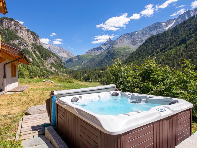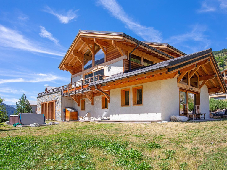 Incantevole chalet di lusso a 1400 m di altitudine in una posizione tranquilla alle porte del Parco Nazionale della Vanoise a Peisey-Nancroix. Lo chalet è dotato di stufa a legna smaltata, sauna, vasca idromassaggio all'aperto e wifi gratuito. Gli interni sono moderni, confortevoli e molto spaziosi: un affascinante chalet di lusso con un'alta qualità di vita. Nella luminosa area benessere con sauna per un massimo di 6 persone, doccia e lettini e vista sul paesaggio, potrete rilassarvi a vostro piacimento. Nel giardino c'è una vasca idromassaggio per un massimo di 6 persone (l'uso è incluso nel prezzo di affitto).