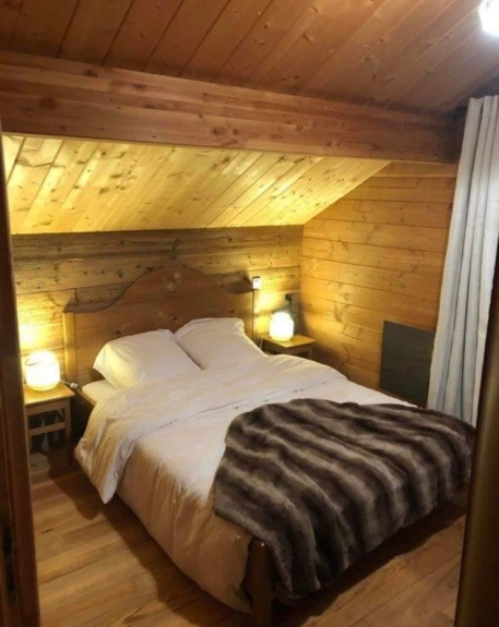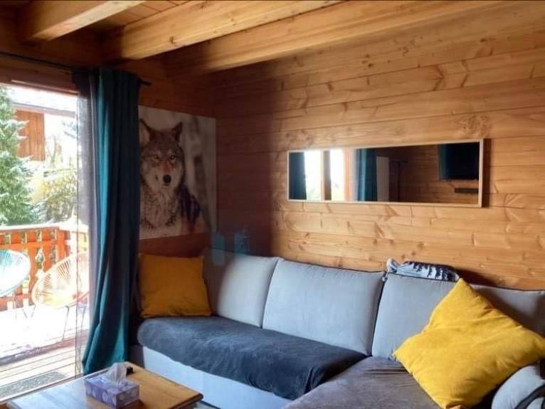 Chalet in legno molto piacevole, indipendente, ben arredato, grande terrazza esposta a sud-ovest, interni caldi, luminosi e moderni, composto da 4 stanze su due livelli, persiane in legno. Riscaldamento elettrico individuale. Posto auto privato n. 1.