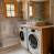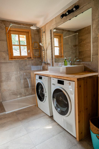 Un bagno in comune, per le camere 2 e 3, dotato di doccia, doppio lavabo, servizi igienici e anche una zona lavanderia con lavatrice e asciugatrice