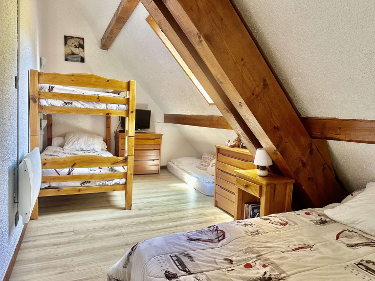 Al livello 3 camera su soppalco con letti a castello 2x90, 1 letto matrimoniale (140 cm x 190 cm) + televisione.