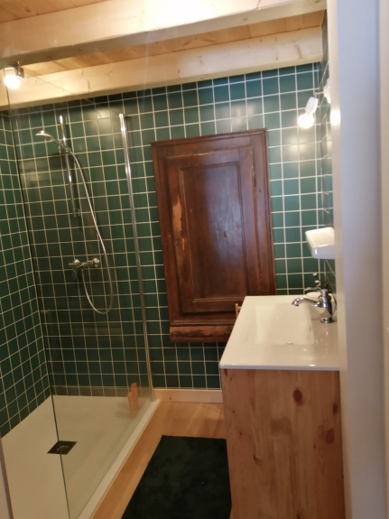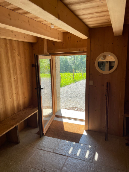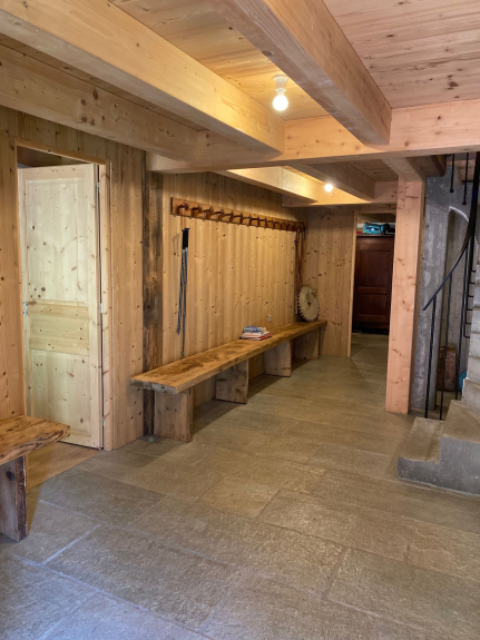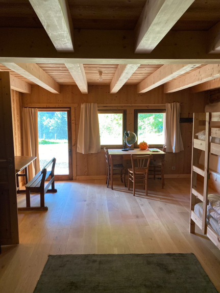 Al piano terra, un bell'ingresso permette di svestirsi e togliersi le scarpe facilmente, un asciugascarpe, una camera da letto con doccia, un ampio dormitorio con 2 letti a castello e un divano letto per la baby sitter!