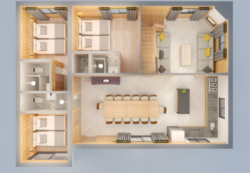 Con 7 camere matrimoniali, ognuna con bagno privato, potrete godere della privacy e dello spazio necessario per rilassarvi dopo una giornata attiva sulle piste.