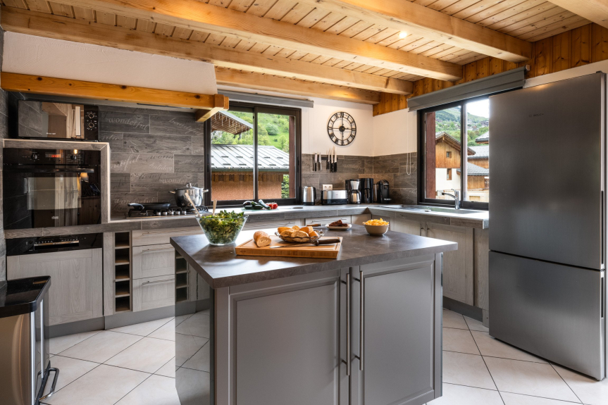 Il cuore caldo del nostro chalet è senza dubbio il camino, dove potrete riunirvi con i vostri cari e rilassarvi davanti alle fiamme scoppiettanti. Ma anche la bella cucina aperta e perfettamente attrezzata e il grande tavolo attorno al quale potrete condividere i vostri pasti.