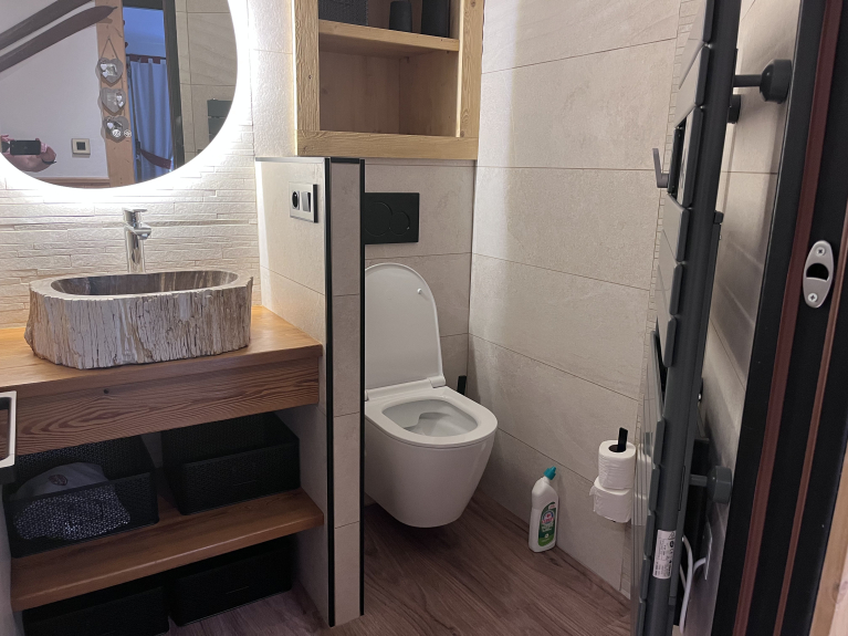 Armadietto privato per gli sci: in estate attrezzato con 3 portabiciclette e mountain bike (altezza massima 80 cm) per bambini sotto i 10 anni, ripiani rimovibili per riporre scarponi da trekking, pattini, palle, racchette da neve ecc.