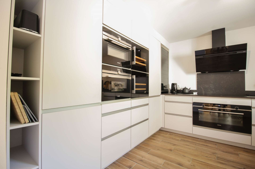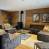Un ampio soggiorno con zona salotto, stufa a pellet, zona pranzo e cucina completamente attrezzata: frigorifero/congelatore, lavastoviglie, piano cottura a induzione, forno e microonde.