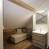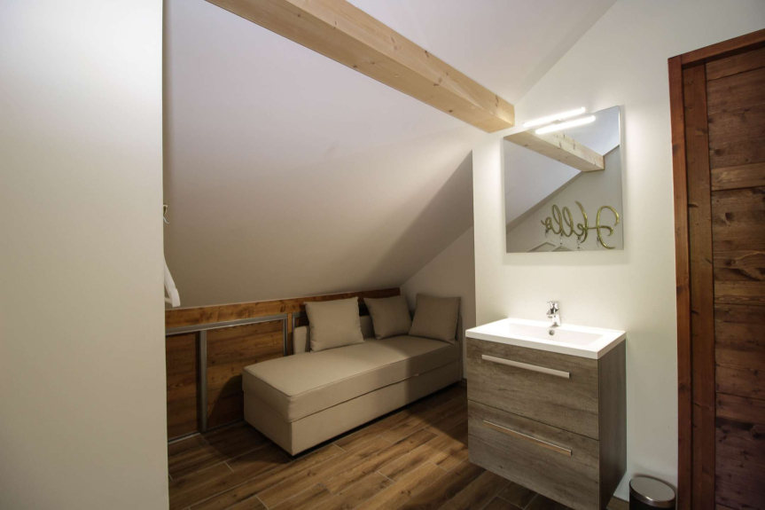 una grande camera da letto mansardata con letto matrimoniale da 160 cm e due divani letto da 70 cm, ideale per i bambini.