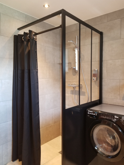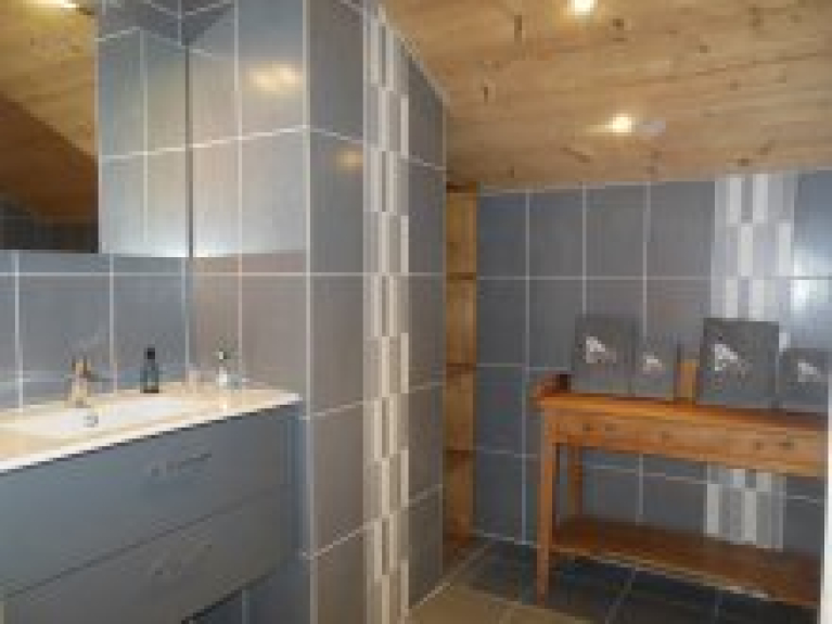 Una seconda camera dormitorio / pavimento in legno, 14 m², da 3 a 5 posti letto, letti 90 cm x 2 m, sedie, velux e il suo bagno con doccia / pavimento piastrellato, 5 m², con doccia italiana molto spaziosa, lavabo, specchio, ripostiglio, radiatore per asciugamani e asciugacapelli a muro.