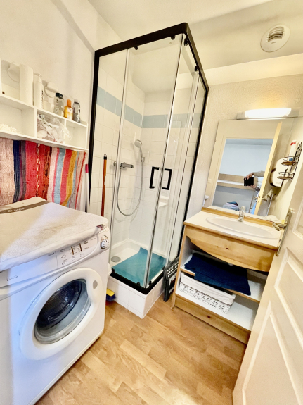 Al piano terra si trova anche una zona notte con letti a castello, un bagno con doccia e lavatrice e un WC separato.