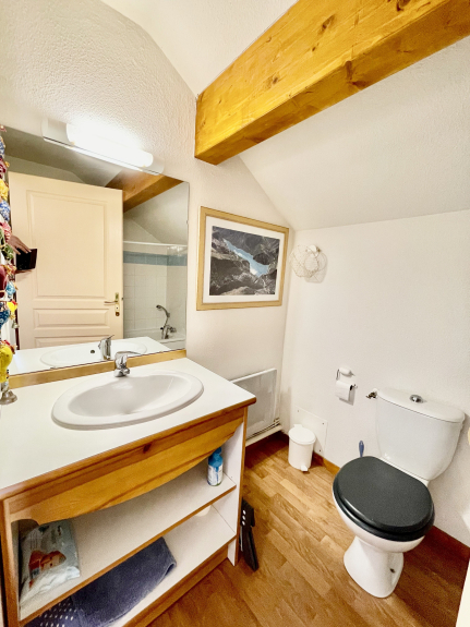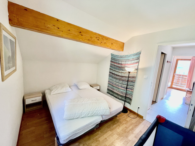 Al piano superiore si trovano 2 camere da letto con letti singoli che possono essere uniti, ampi armadi, comodini e un bagno con WC. Una delle due camere da letto ha un balcone con vista sulle montagne. Per i più piccoli è presente una barriera di sicurezza in cima alle scale.