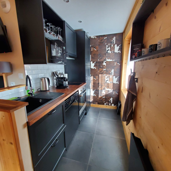 1 cucina completamente attrezzata con forno, microonde, lavastoviglie, macchina per raclette e piano cottura a induzione