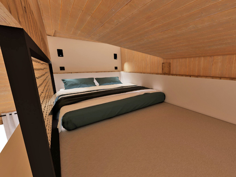 2 camere da letto (letto matrimoniale + materasso su soppalco con scala e sottopasso)