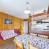Angolo cottura: 2 piastre in vetroceramica, frigorifero, cappa aspirante, lavastoviglie, forno a microonde combinato, TV.