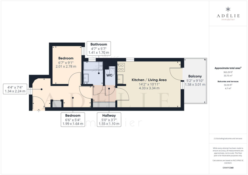 BEL213: bilocale per 6 persone, 30 m², classificato 2*.