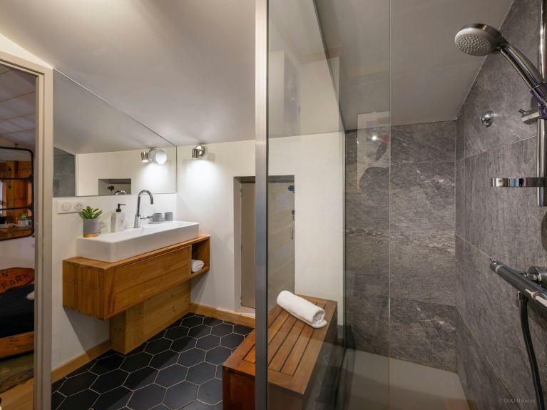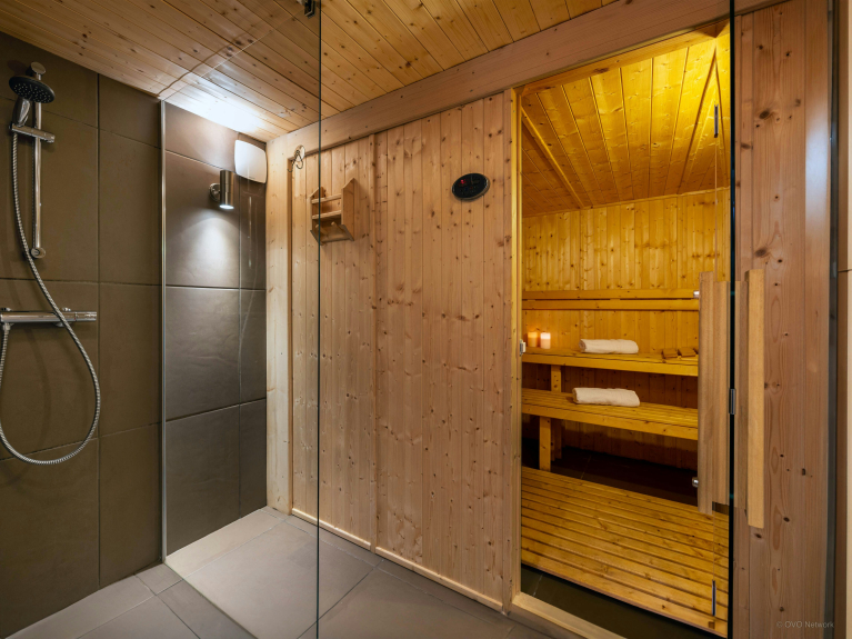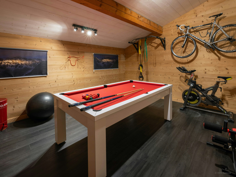 Il garage coperto è stato trasformato in una sala per lo sport, i giochi e il relax, dove si possono anche riporre le biciclette. Se necessario, è possibile parcheggiare fino a 4 auto all'esterno dello chalet.
