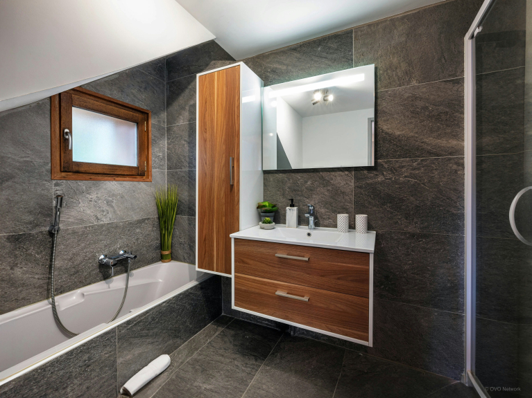 La proprietà è disposta su 3 livelli, con 3 camere da letto e un bagno al piano giardino e 2 camere da letto e un bagno al piano superiore. Si tratta di una disposizione perfetta per due famiglie che desiderano trascorrere una vacanza insieme in montagna. Ogni famiglia avrà il proprio spazio, ma tutti potranno riunirsi per le attività, i pasti e il relax.