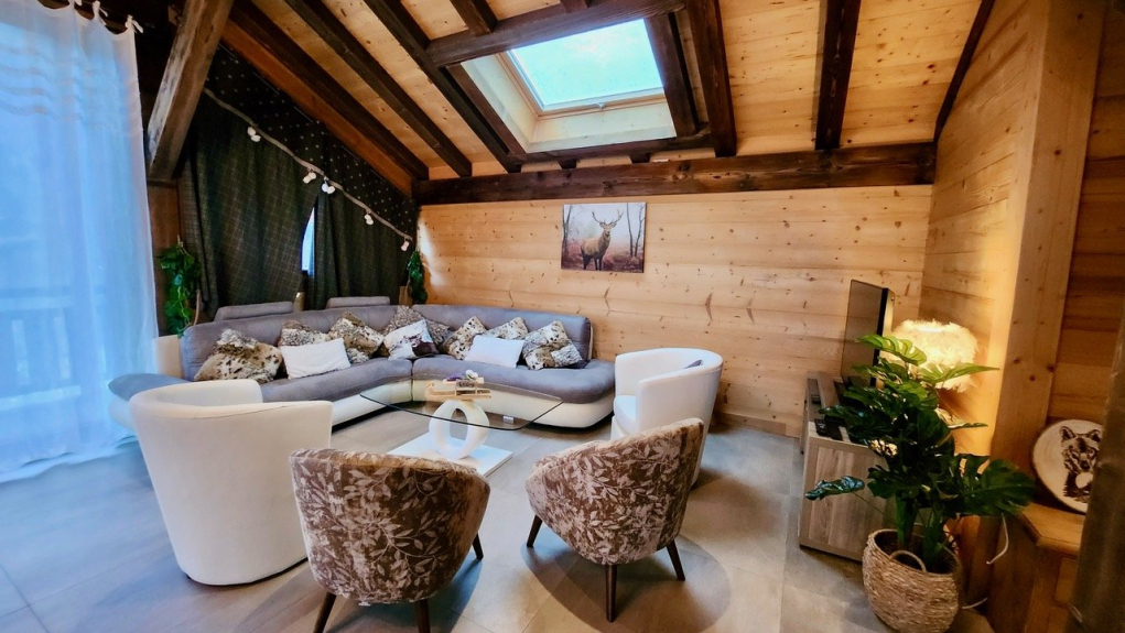 Lussuoso soggiorno con grande CHEMINÉE rustica rivestita in pietra e legno e BABYFOOT, molto luminoso grazie alle sue grandi finestre panoramiche. Connessione WIFI.