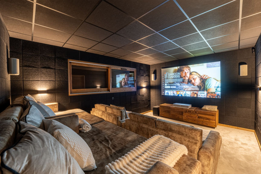 Una sala cinema con poltrone, maxi schermo HD e sistema home cinema 360° surround.