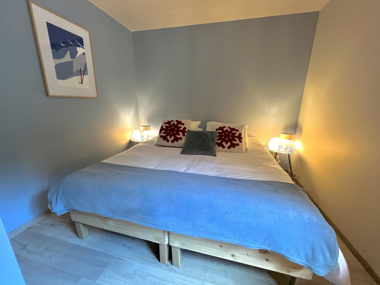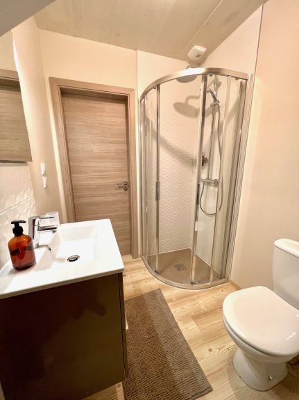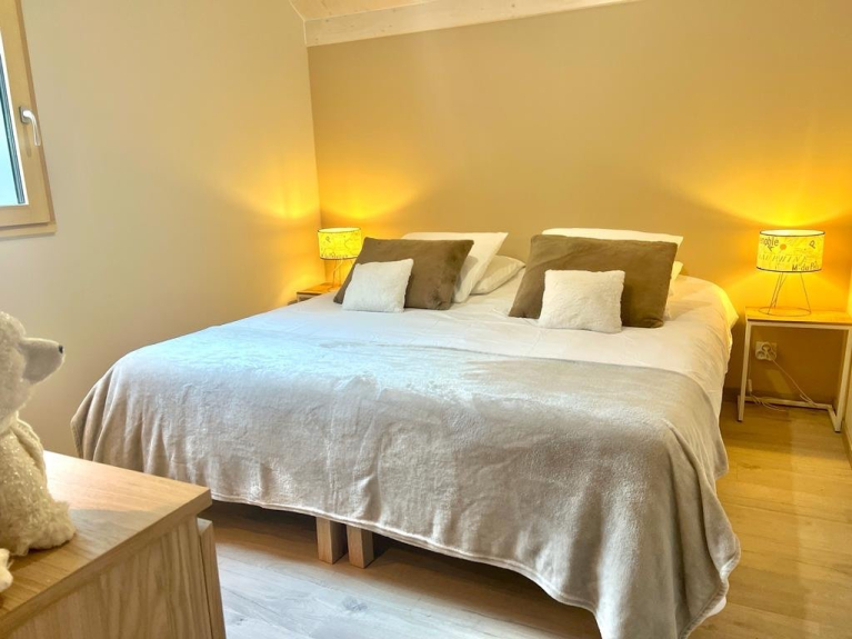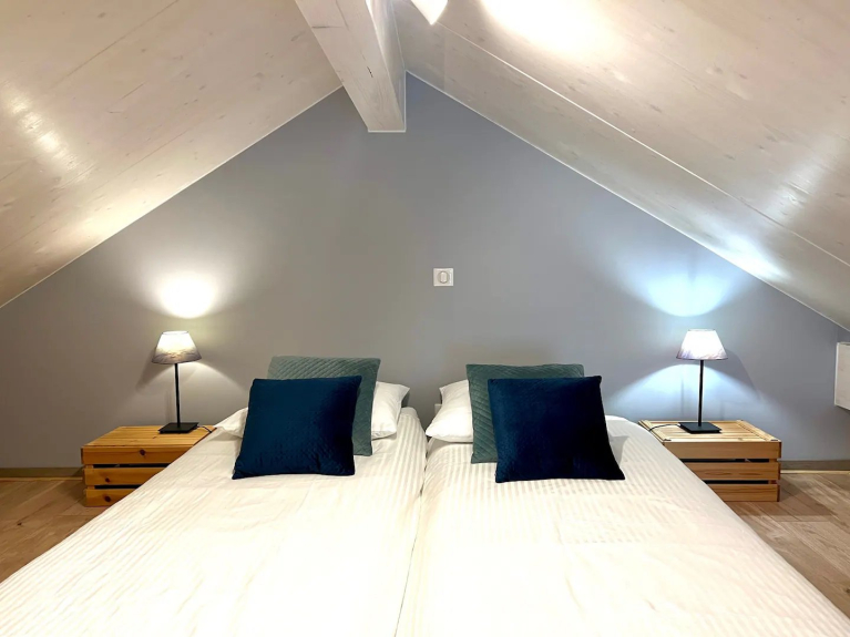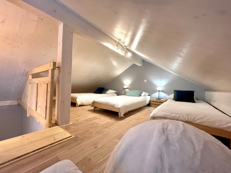 Nu chalet di 98 m2 per un massimo di 10 persone, 3 camere doppie (2 con letti king-size), 1 camera soppalcata con 4 letti singoli, 2 bagni, 2 WC.