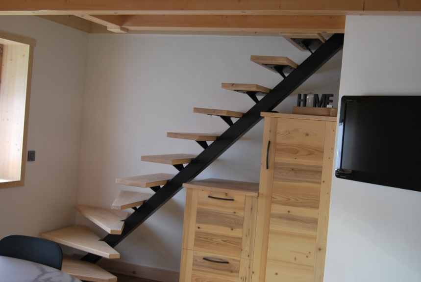 Chalet di 56 m2. Piano terra: cucina e soggiorno, bagno con WC,