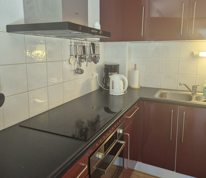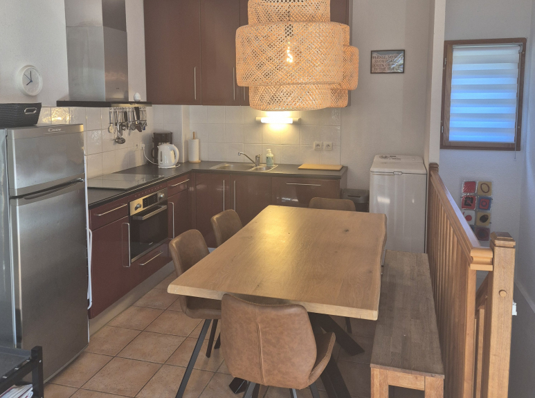 Al piano superiore si trova una cucina aperta con zona pranzo e un accogliente soggiorno con una splendida vista sulle montagne. Il divano del soggiorno può essere utilizzato anche come divano letto. La cucina è completamente attrezzata con piano cottura a induzione, forno combinato/microonde, lavastoviglie, frigorifero e lavatrice.