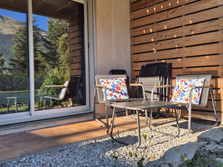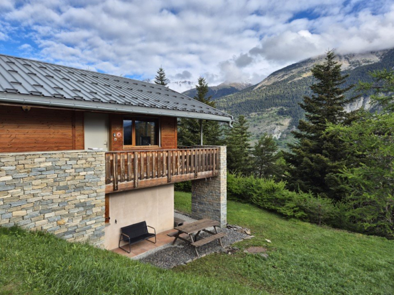 Lo chalet è circondato da un ampio e soleggiato giardino con terrazza, diverse sedie e un tavolo da picnic – perfetto per mangiare all’aperto o semplicemente godersi l’aria fresca di montagna. Sulla veranda si trova un armadietto per gli sci con serratura.
