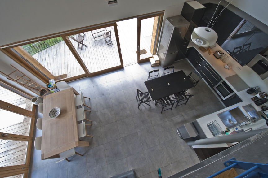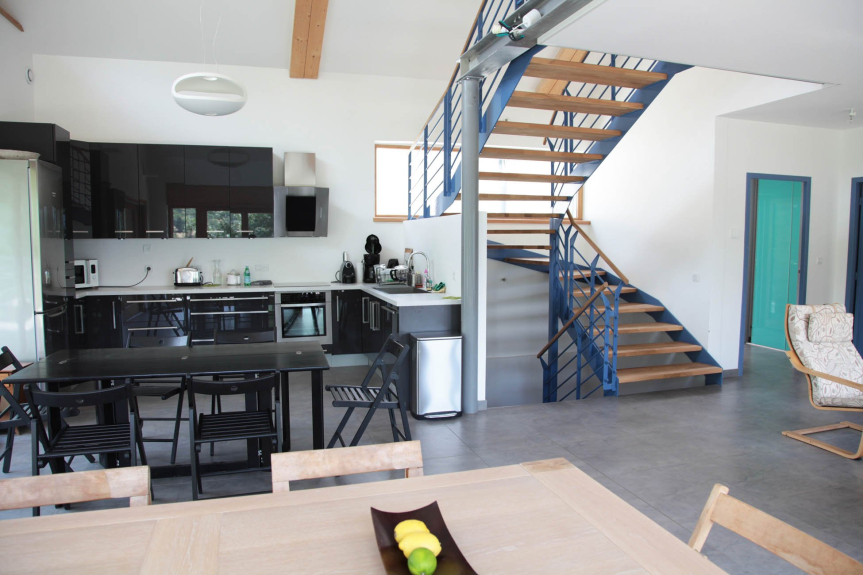 - un soggiorno di 80 m² con cucina completamente attrezzata, tavolo da pranzo, salotto e camino.