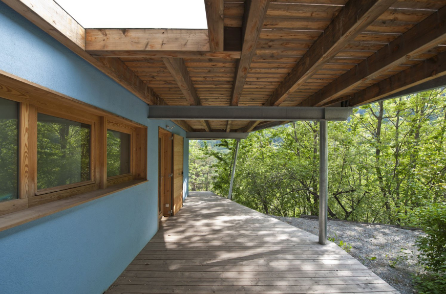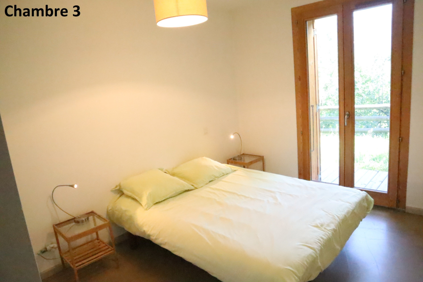 - tre camere da letto che si aprono sulla terrazza inferiore, ciascuna con letto matrimoniale di 140 cm, armadio, lavabo e porta-finestra con vista sul giardino e sulle montagne.