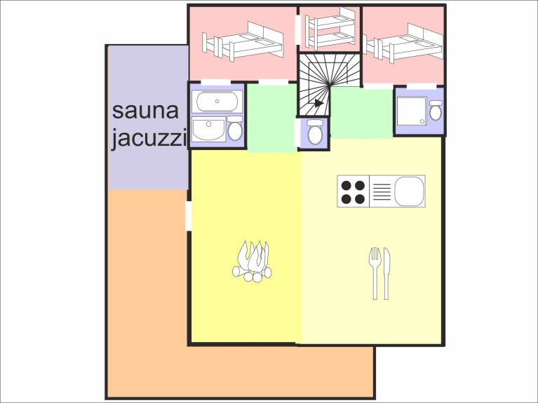 Piano 1: la zona giorno è caratterizzata da un ampio soggiorno con divani e poggiapiedi, TV e camino. La zona pranzo può ospitare comodamente 15 persone. WC separato. La cucina a pianta aperta è completamente attrezzata. Accesso alla spaziosa terrazza esposta a ovest con tavolo e sedie. Qui si trovano la vasca idromassaggio all'aperto (per circa 4-6 persone) e la cabina della sauna (anch'essa per 4-6 persone). Dopo lo sci, godetevi una seduta nella sauna o un bagno rilassante nella vasca idromassaggio.