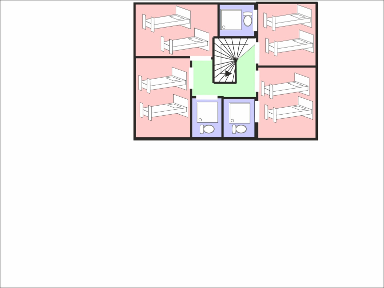 Piano 2: Su questo livello si trovano quattro camere matrimoniali: due camere con due letti singoli accostabili e un bagno privato con doccia, lavabo, WC e scaldasalviette.