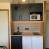 Una cucina a pianta aperta recentemente rinnovata con piano cottura, frigorifero, lavastoviglie, microonde, macchina per il caffè a cialde Senseo, tostapane, macchina per raclette e macchina per fonduta.