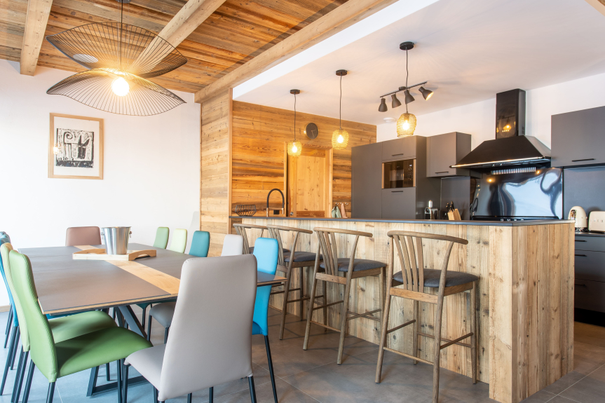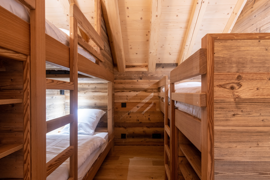Con una superficie di 250 m2 e disposto su 3 livelli, questo chalet bifamiliare può ospitare 15 persone (di cui un massimo di 10 adulti). Per gruppi fino a 30 persone, oltre allo Chalet Lorna, è possibile affittare anche l'adiacente Chalet Kiera, con 15 posti letto.