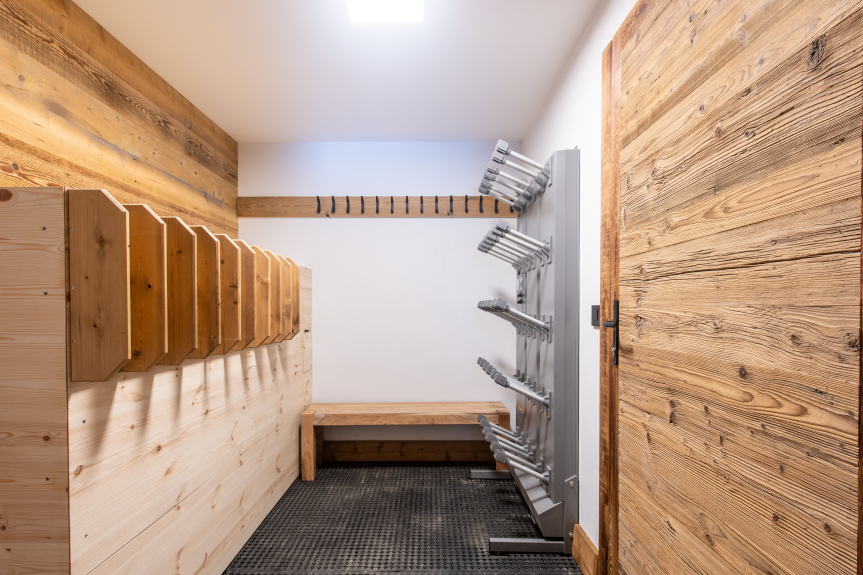 Infine, al piano terra troverete un garage per parcheggiare un'auto (sotto i 4,50 m), una toilette separata e un deposito sci con panche e asciugascarponi, molto pratico al ritorno dallo sci.