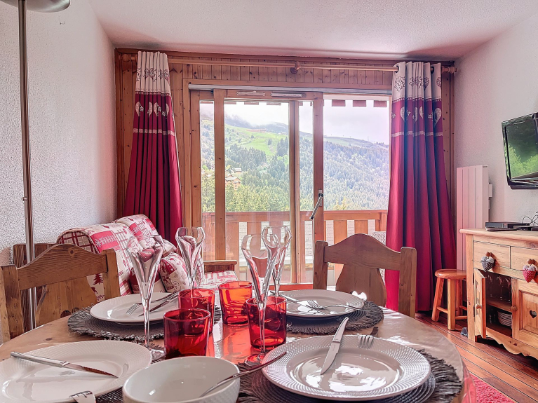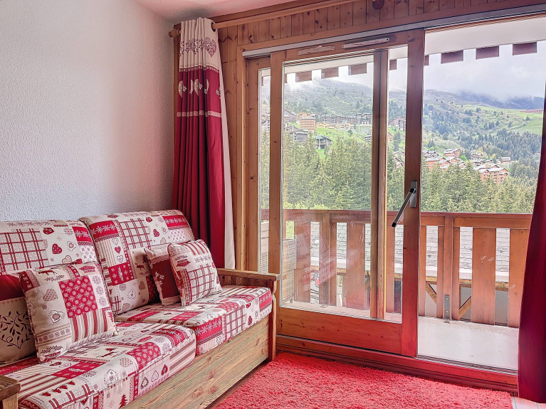 Il soggiorno si apre su un balcone con vista sulle montagne e sul centro di Mottaret. È presente un televisore.