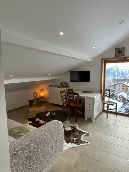 Al secondo piano di uno chalet con 3 appartamenti, è composto da un soggiorno con un grande bovindo esposto a sud e da 2 camere da letto con letti matrimoniali.