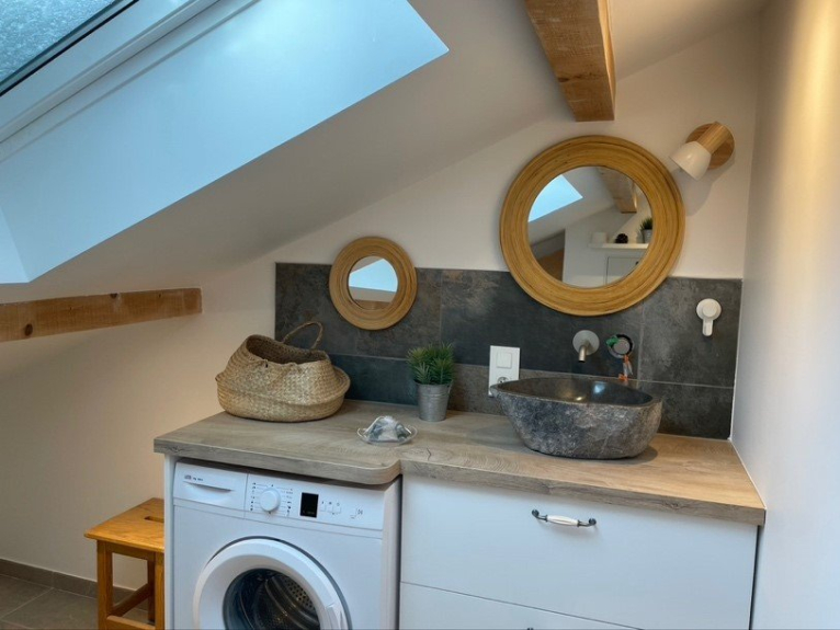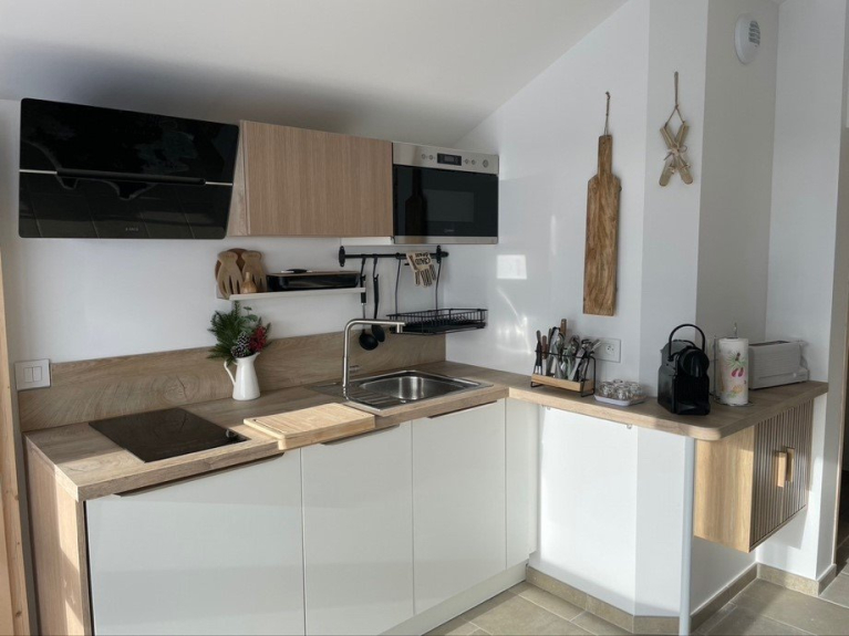 La cucina a vista è dotata di piano cottura a induzione, microonde e lavastoviglie. Nell'ampio bagno con doccia si trova una lavatrice.