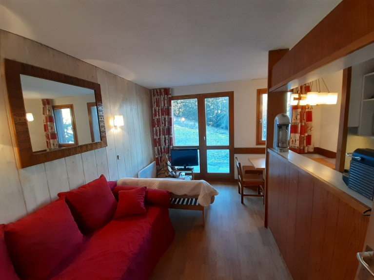 Questo bilocale (28 m²) può ospitare un massimo di 4 o 5 persone e si trova al piano terra di un residence con ascensore. Il soggiorno si apre su una terrazza semi-coperta.
