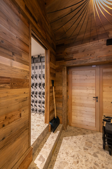 L'ingresso dedicato alle attività all'aperto, pratico per la partenza o il ritorno dallo sci e comodo con rastrelliere riscaldate per scarponi, caschi e guanti.