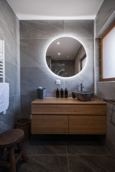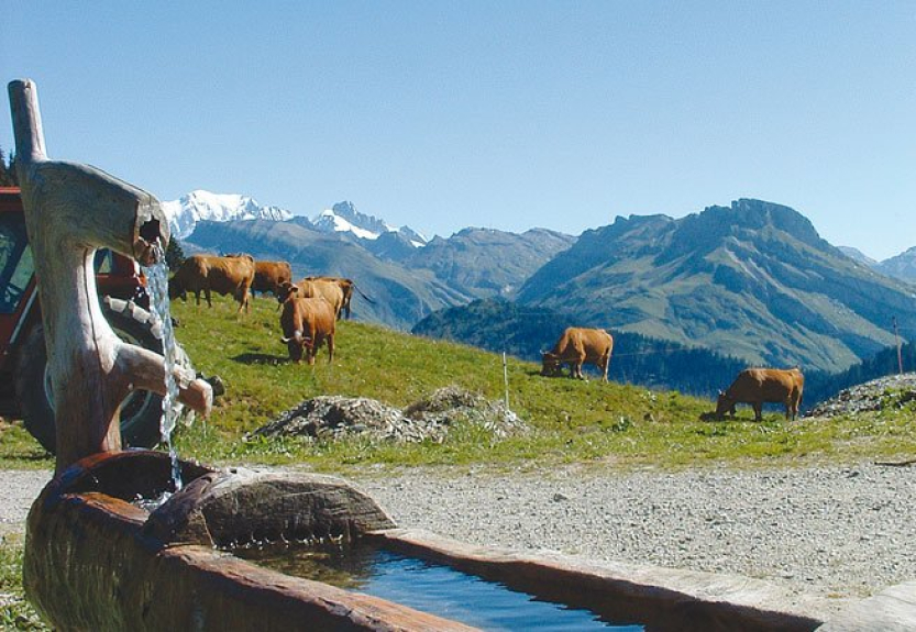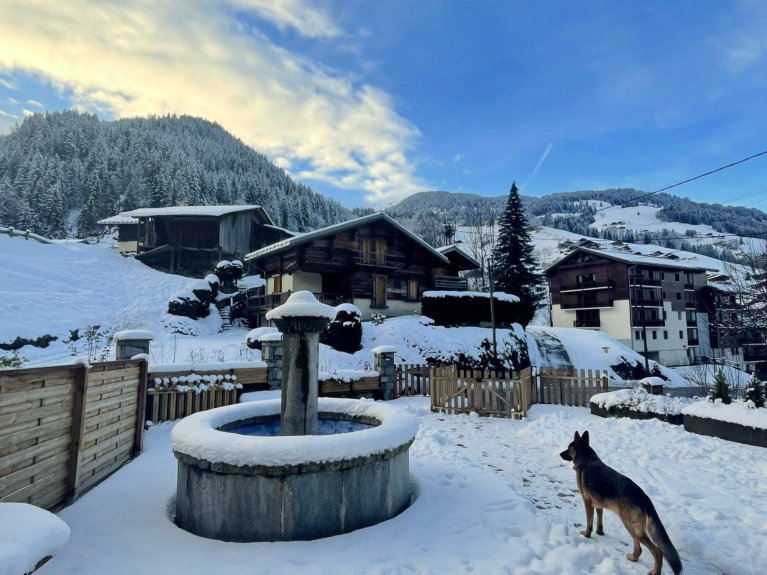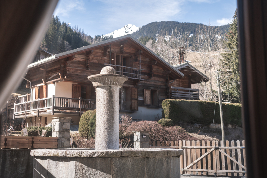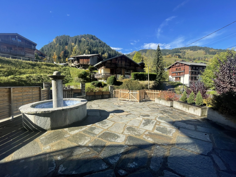 Un elemento esterno unico ad Arêches: la terrazza di 110 m² con fontana in pietra (la fontana non è in funzione).