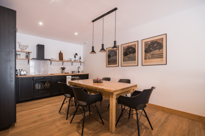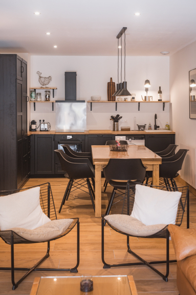Fontana Alta offre 73 m² di comfort, con un ampio soggiorno di oltre 40 m², una cucina a vista completamente attrezzata e una zona pranzo progettata per ospitare comodamente fino a 8 persone.