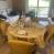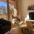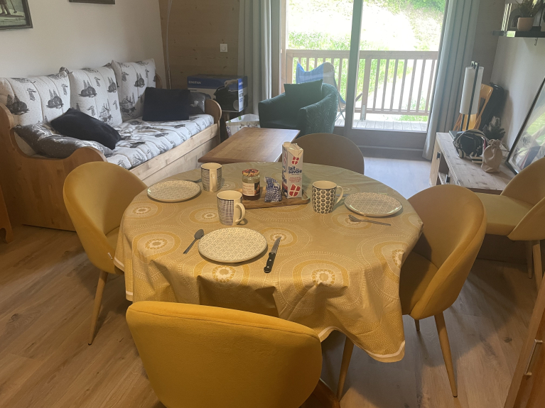 Soggiorno con TV, divano con due letti singoli, tavolino, balcone in legno non affacciato con sedie reclinabili. Zona pranzo con 6 sedie.
