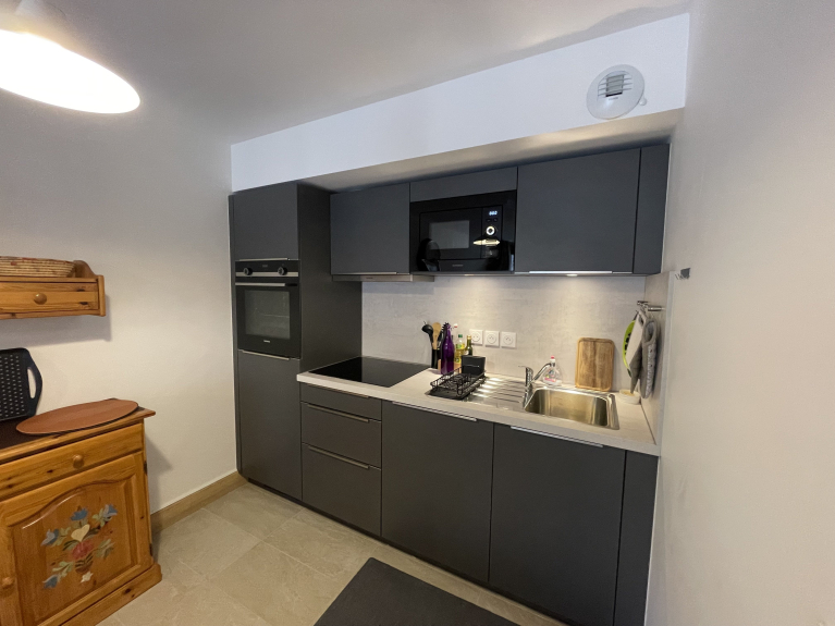 Situata al 2° piano con ascensore, la cucina si apre sul soggiorno ed è dotata di attrezzature nuove: lavastoviglie, forno, piano cottura in vetroceramica, frigorifero con congelatore, macchina del caffè elettrica con chicchi, tostapane, macchina per raclette e fonduta.