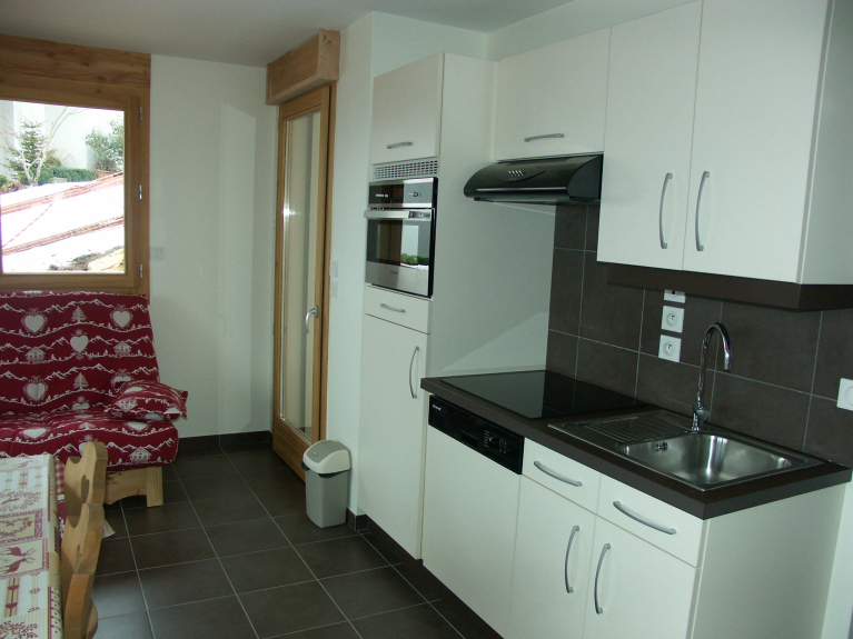 Soggiorno con angolo cottura, molto ben attrezzato, arredamento savoiardo.