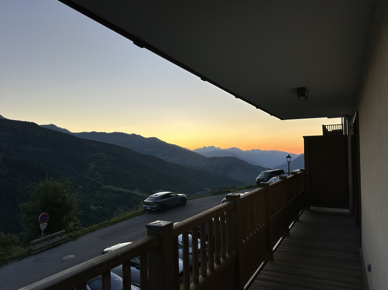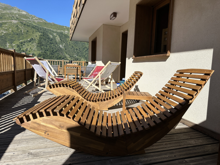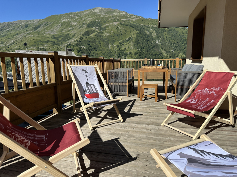 La grande terrazza angolare esposta a sud-est (45 m²) offre una vista mozzafiato sulle montagne e sulla valle. Approfittate dei mobili da giardino e delle sedie a sdraio per colazioni soleggiate, aperitivi al tramonto o semplicemente per un momento di lettura di fronte alle cime.